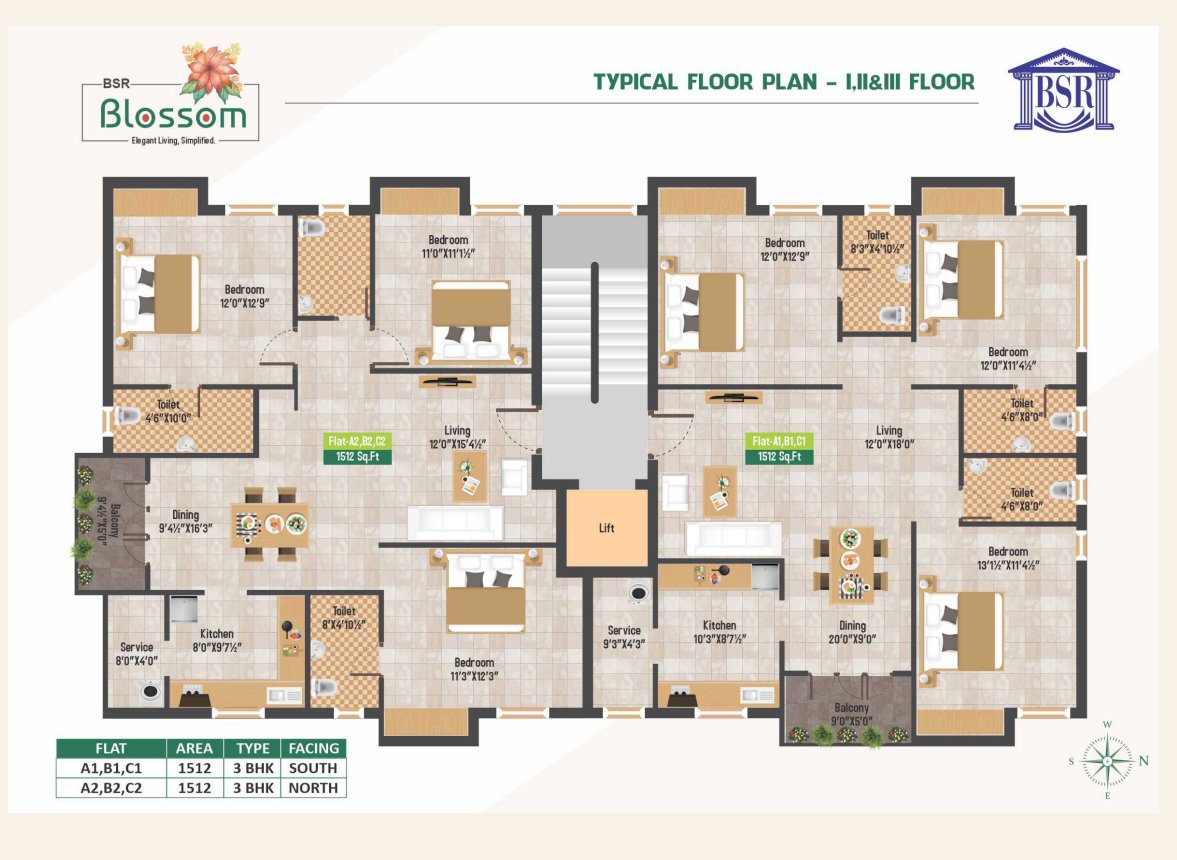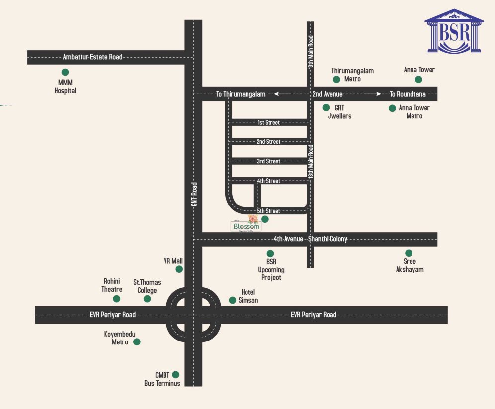 BSR’s signature project, Blossom, is a premium residential development crafted to offer a blend of elegance and modern living. Located at Nehru Nagar – Anna Nagar, this project is designed to provide an ideal lifestyle with panoramic views, ample sunlight, and superior ventilation, ensuring comfort throughout the year. The development features thoughtfully planned homes with large glazed windows that seamlessly connect the indoors with the beauty of the outdoors. With quality finishes and contemporary architecture, BSR Blossom is not just a home but a statement of sophistication and comfort. Situated in a well-developed neighborhood with access to wide roads, streetlights, and essential infrastructure, the project is ideal for both end-users and investors alike. The location also offers excellent connectivity to key parts of Chennai, making it a convenient and promising destination for modern families. With RERA approval and backed by BSR’s commitment to quality, Blossom ensures not only a comfortable lifestyle but also excellent appreciation potential in the near future.